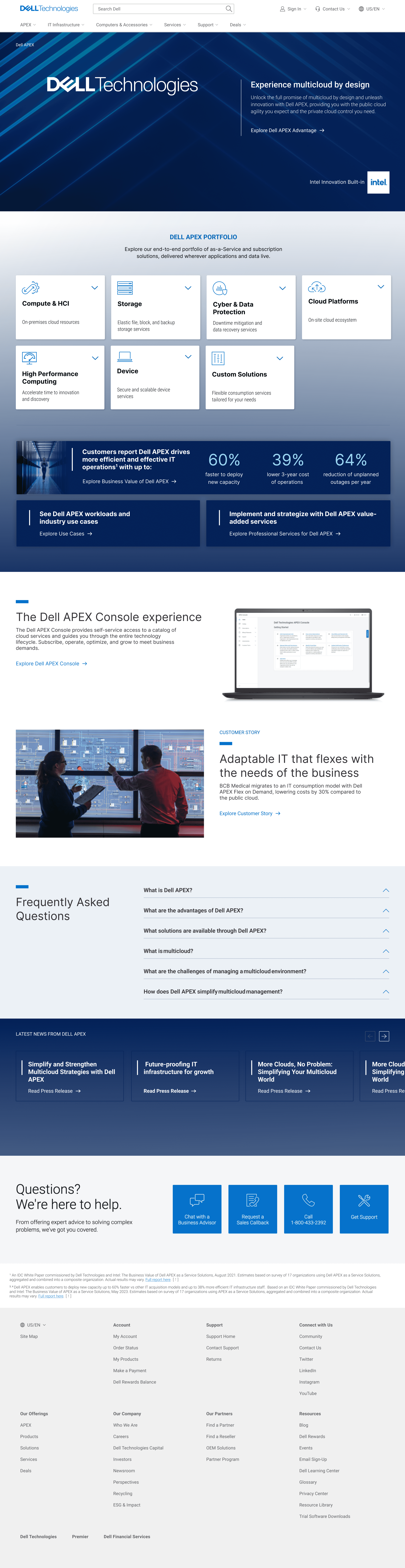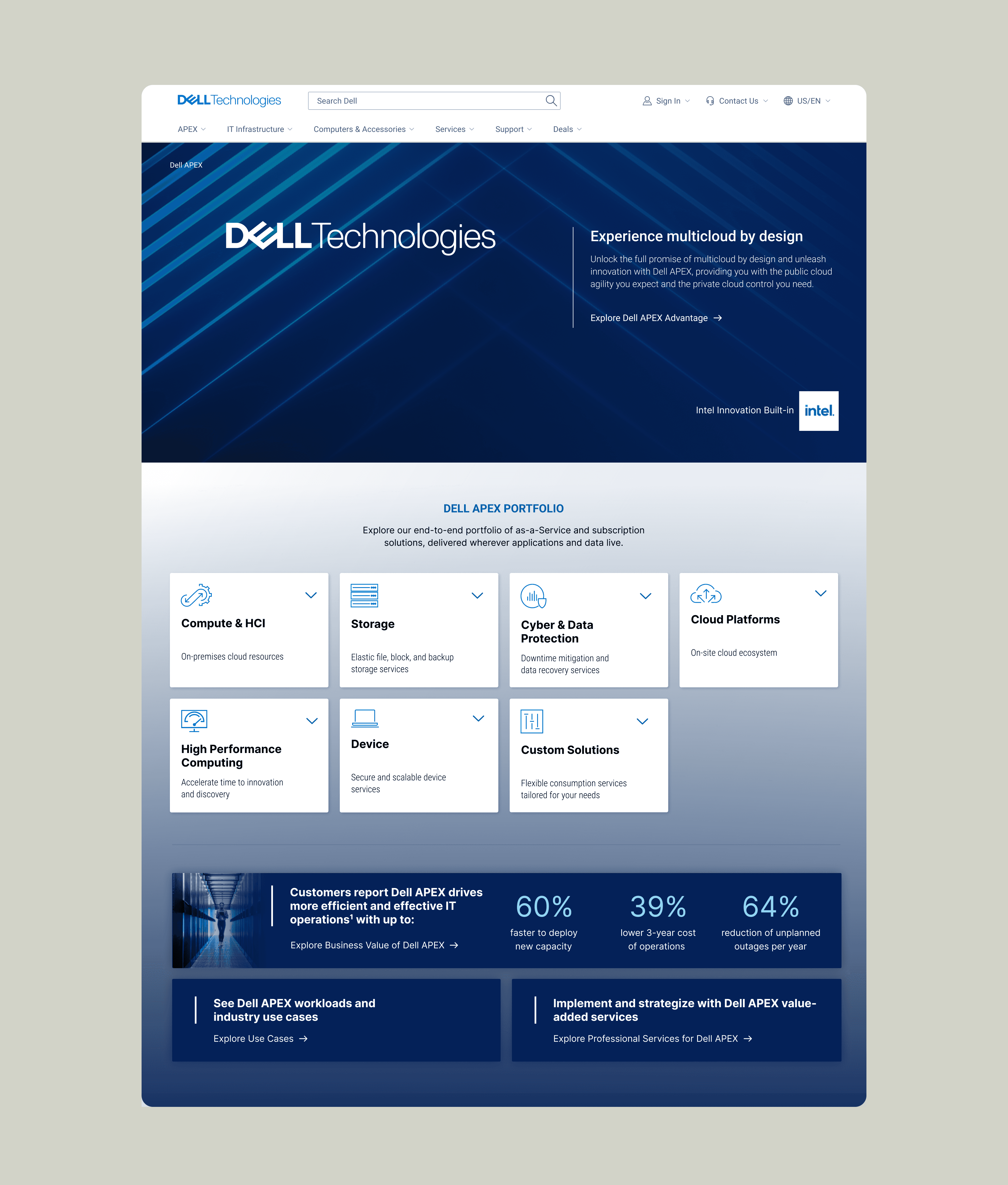Reframing the homepage as a gateway to the portfolio helped users quickly understand where to begin and how APEX was organized. By surfacing solution categories directly on the homepage and reducing navigation friction, the experience better aligned with how enterprise buyers explore infrastructure solutions. It also established a scalable entry pattern that supported the broader portfolio architecture and made it easier to introduce new services without increasing complexity.