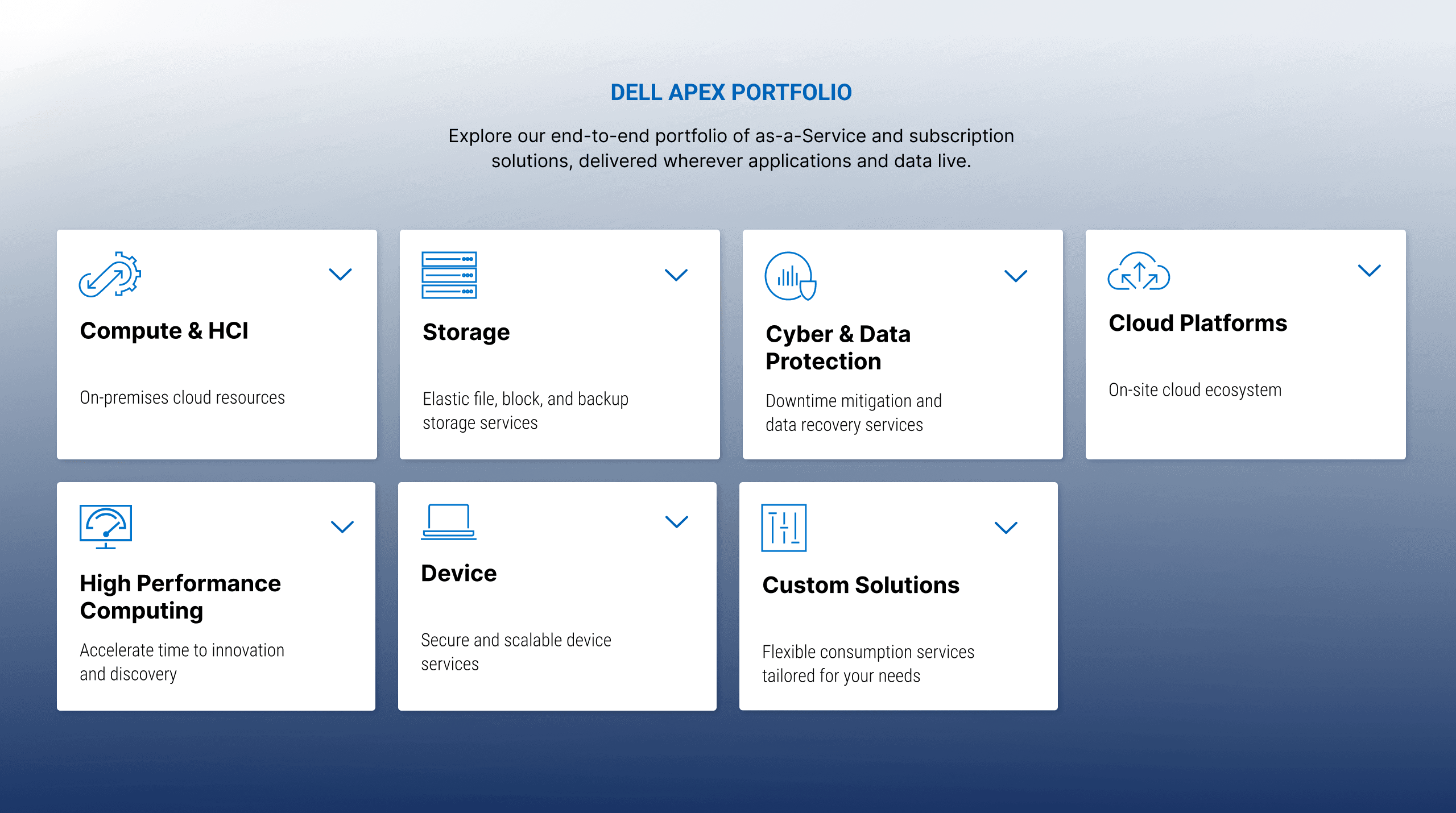 From the homepage, users could enter the APEX portfolio through clearly defined solution categories. Each category represented a group of related services designed to address specific infrastructure needs.