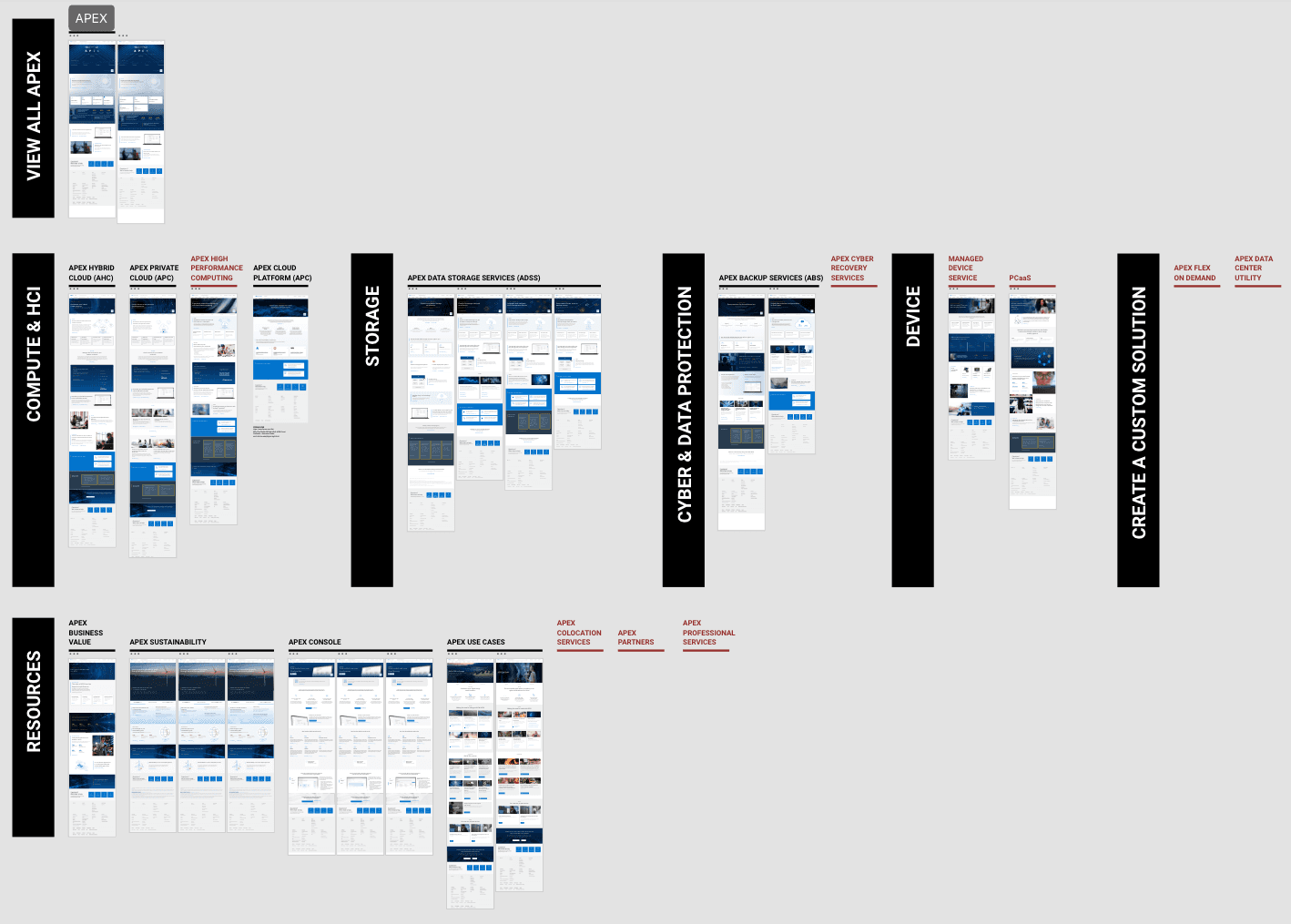 This shift allowed the team to move from reactive page production to intentional system design. To understand the scope of the ecosystem, I mapped the full APEX portfolio and grouped existing pages into categories. This helped visualize the scale of the platform and revealed where structure and differentiation were missing.